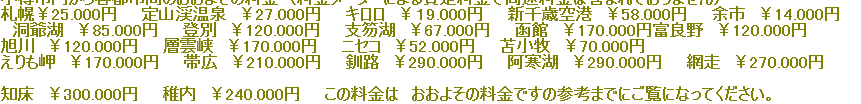 | 上記の料金は、ジャンボタクシー山崎の おおよその料金ですので、普通車の詳細は、小樽観光タクシー山崎まで お問い合わせください! | ||||||||||||||||||||||||||||||||||||||||||||||||||||||||||||||||||||||||